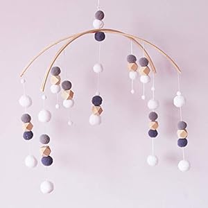 Mobile mit Filzbällen und Federornamenten, zum Aufhängen über dem Kinderbett.