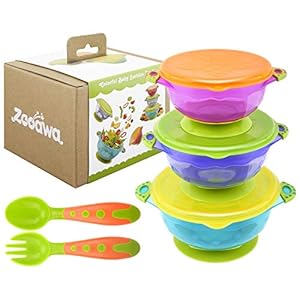 Zooawa Baby Saugnapf mit Deckel Set, Gabel, Löffel, 3 Pack Rutschfest Kinder Geschirr Schüssel Schale Schälchen Set…